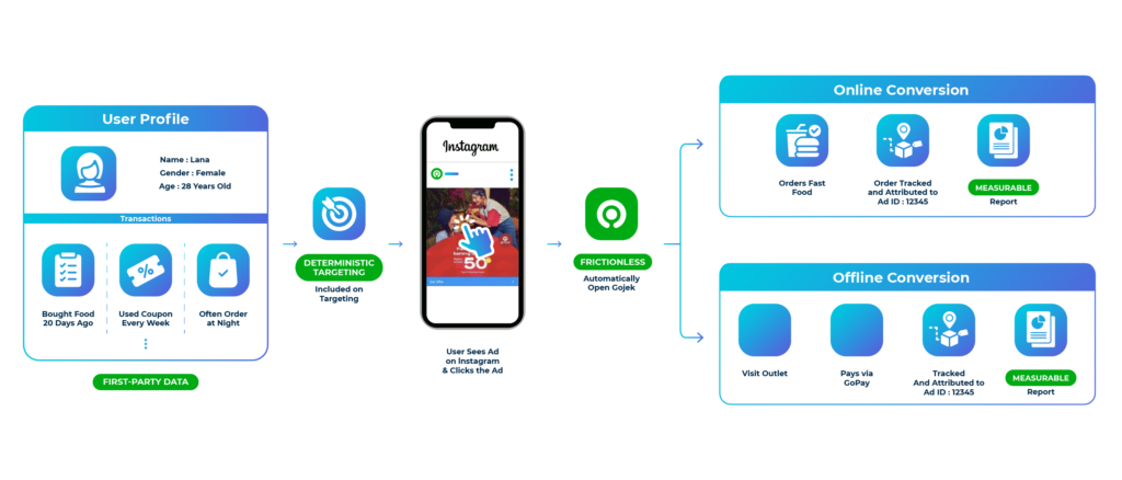 Gojek’s targeting is deterministic based on not only behaviors but also customers’ past transactions and preference in spending money, making your ads drive transactions more easily!