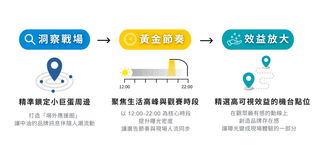 比賽期間,全台民眾關注焦點集中在球賽直播與相關活動。中油希望能在賽事熱潮中,以有效且精準的在地行銷方式,觸及觀賽人潮與棒球迷族群,提升品牌曝光與支持度。然而,如何在大型體育場館周邊的高人流區域中,有效傳達品牌精神、最大化廣告效益,是此次活動的主要挑戰。