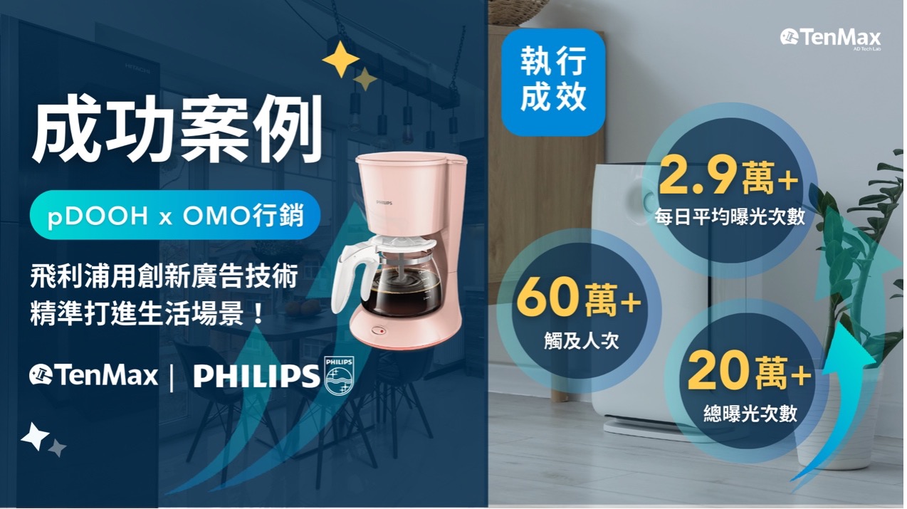另一個典型應用場景則來自飛利浦義式咖啡機新品上市活動。活動期間僅七天,TenMax 鎖定台北市 35 間高潛力門市,依據不同商圈特性設計情境化廣告內容,讓訊息更貼近消費者當下需求。同時結合 Beacon 技術與 LINE 官方帳號互動,將 pDOOH 曝光延伸至手機端,形成「看得到、收得到、買得到」的 OMO 行銷閉環。最終活動累積約 20 萬次曝光、60 萬人流觸及,並觸發超過 1 萬筆 Beacon 推播,成功帶動品牌好友數成長與互動深度提升。