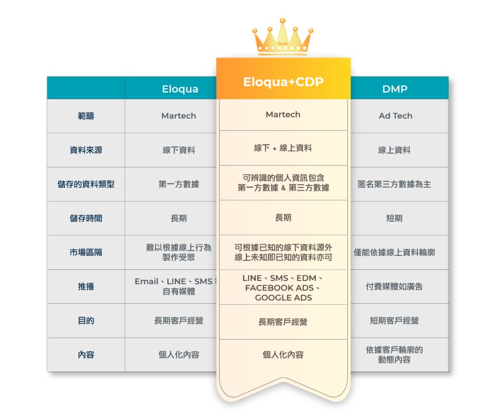 CDP(Customer Data Platform)客戶數據平台,顧名思義以蒐集客戶第一方數據(1st-party Data)為導向,除原先 Eloqua 能夠處理的線下資料外,CDP 完整收攏消費者於自家網站的各式足跡,同步將分眾傳送至廣告系統進行廣告投遞,360 度環視客戶樣貌,真正達成 OMO(Offline-Merge-Online)全通路整合的願景。
